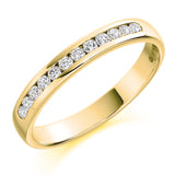 This Ladies 9ct Yellow Gold Half Set Round Brilliant 0.25ct Diamond 3mm Wedding Ring is in a channel set. A channel set wedding ring has a neat edged style which allows each diamond to sit perfectly side by side. This style is traditional and should be worn next to a engagement ring with either plain shoulders or diamond channel set shoulders of the same style.