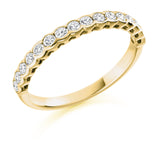 This Ladies 9ct Yellow Gold Half Set Round Brilliant 0.50ct Diamond 2.5mm Wedding Ring is in a rubover set. A rubover setting describes how each diamond is held. When the diamond is added to the ring it is dropped down into a perfect seat before a small portion of metal is carefully rubbed over the outer edge. This holds it safely in place and creates a clean smooth finish.