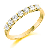 This Ladies 9ct Yellow Gold Half Set Round Brilliant 0.50ct Diamond 2.5mm Wedding Ring is in a claw set. A claw set wedding ring complements almost any engagement ring as the claws which hold each diamond resemble the claws which hold the diamond in an engagement ring. This means that a claw set wedding ring is a great addition in most cases.