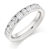This Ladies Platinum 950 Half Set Mixed 1.00ct Diamond 4mm Wedding Ring is in a channel set. A channel set wedding ring has a neat edged style which allows each diamond to sit perfectly side by side. This style is traditional and should be worn next to a engagement ring with either plain shoulders or diamond channel set shoulders of the same style.