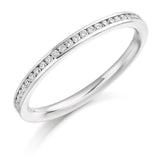 This Ladies Platinum 950 Half Set Round Brilliant 0.20ct Diamond 2mm Wedding Ring is in a channel set. A channel set wedding ring has a neat edged style which allows each diamond to sit perfectly side by side. This style is traditional and should be worn next to a engagement ring with either plain shoulders or diamond channel set shoulders of the same style.
