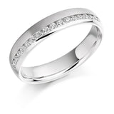 This Ladies Platinum 950 Half Set Round Brilliant 0.26ct Diamond 4mm Wedding Ring is in a channel set. A channel set wedding ring has a neat edged style which allows each diamond to sit perfectly side by side. This style is traditional and should be worn next to a engagement ring with either plain shoulders or diamond channel set shoulders of the same style.