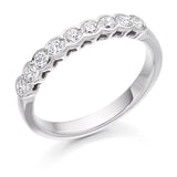 This Ladies Platinum 950 Half Set Round Brilliant 0.50ct Diamond 3mm Wedding Ring is in a rubover set. A rubover setting describes how each diamond is held. When the diamond is added to the ring it is dropped down into a perfect seat before a small portion of metal is carefully rubbed over the outer edge. This holds it safely in place and creates a clean smooth finish.