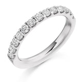 This Ladies Platinum 950 Half Set Round Brilliant 0.75ct Diamond 2.7mm Wedding Ring is in a claw set. A claw set wedding ring complements almost any engagement ring as the claws which hold each diamond resemble the claws which hold the diamond in an engagement ring. This means that a claw set wedding ring is a great addition in most cases.