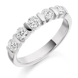 This Ladies Platinum 950 Half Set Round Brilliant 0.75ct Diamond 3.5mm Wedding Ring is in a rubover set. A rubover setting describes how each diamond is held. When the diamond is added to the ring it is dropped down into a perfect seat before a small portion of metal is carefully rubbed over the outer edge. This holds it safely in place and creates a clean smooth finish.