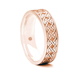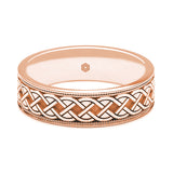 The continual rope pattern around the centre section of this men's 18ct rose gold gold flat court wedding ring is perfectly bordered with a traditional millgrain patterned edge. We are always very happy to create a new wedding ring design using your very own pattern. Pop us a call or come and visit us in our Manchester jewellery workshop.