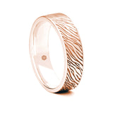 The light and dark areas created by this unique laser patterning give this men's 18ct rose gold gold flat court wedding ring the illusion of an interesting and modern zebra inspired design. We can create any pattern or design with laser engraving so please do get in touch if you would like to use your own design.