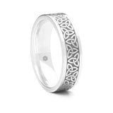 The repeated Trinity Knot around the outside of this men's 18ct white gold gold flat court wedding ring gives this ring a classic Celtic look. If you have a celtic knot design which you love, we will be very happy to laser engrave this onto a handmade wedding band for you. Simply call us on 0161 4282820.