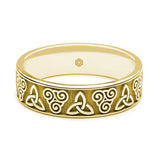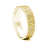 Featuring two Celtic symbols, the Trinity Knot and the Treskilion gives this men's 18ct yellow gold gold flat court celtic wedding ring a slight twist on the more traditional Celtic styling. If you have a celtic knot design you would like to use on your wedding ring, we would love to make this bespoke celtic wedding ring for you.