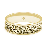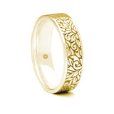 Inspired by nature, this stunning men's 18ct yellow gold gold flat court wedding ring features a flowing leaf pattern around its outer surface. Nature inspired designs are very popular indeed. You can visit our Manchester jewellery showroom to view all our handmade wedding ring. simple give us a call on 0161 4282820.