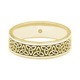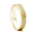 The repeated Trinity Knot around the outside of this men's 18ct yellow gold gold flat court wedding ring gives this ring a classic Celtic look. If you have a celtic knot design which you love, we will be very happy to laser engrave this onto a handmade wedding band for you. Simply call us on 0161 4282820.