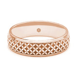 The clever use of a geometric pattern around the surface of this men's 9ct rose gold court shape wedding ring delivers an eye-catching star and circle design.
