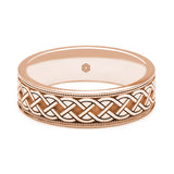 The continual rope pattern around the centre section of this men's 9ct rose gold flat court wedding ring is perfectly bordered with a traditional millgrain patterned edge. We are always very happy to create a new wedding ring design using your very own pattern. Pop us a call or come and visit us in our Manchester jewellery workshop.