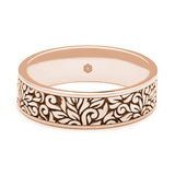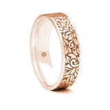 Inspired by nature, this stunning men's 9ct rose gold flat court wedding ring features a flowing leaf pattern around its outer surface. Nature inspired designs are very popular indeed. You can visit our Manchester jewellery showroom to view all our handmade wedding ring. simple give us a call on 0161 4282820.