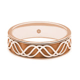 The two interwoven wave patterns flow around this men's 9ct rose gold flat court wedding rings surface giving an effect similar to a double helix design. Our jewellery workshop means that we can create your perfect wedding rings with ease. Call us today to arrange a viewing or appointment at our Manchester showrooms on 0161 4282820.