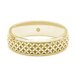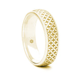 The clever use of a geometric pattern around the surface of this men's 9ct yellow gold court shape wedding ring delivers an eye-catching star and circle design.