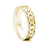 The continuous loop of connected heart symbols surely make this men's 9ct yellow gold flat court wedding ring the ultimate symbol of love? If you have your own sysmbol of love which is special to you, we would love to add this to your wedding ring. Call us on 0161 4282820 to discuss your idea.