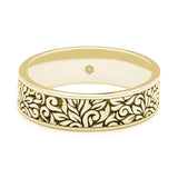 Inspired by nature, this stunning men's 9ct yellow gold flat court wedding ring features a flowing leaf pattern around its outer surface. Nature inspired designs are very popular indeed. You can visit our Manchester jewellery showroom to view all our handmade wedding ring. simple give us a call on 0161 4282820.