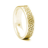 The repeated Trinity Knot around the outside of this men's 9ct yellow gold flat court wedding ring gives this ring a classic Celtic look. If you have a celtic knot design which you love, we will be very happy to laser engrave this onto a handmade wedding band for you. Simply call us on 0161 4282820.