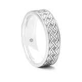 The continual rope pattern around the centre section of this men's palladium 500 gold gold flat court wedding ring is perfectly bordered with a traditional millgrain patterned edge. We are always very happy to create a new wedding ring design using your very own pattern. Pop us a call or come and visit us in our Manchester jewellery workshop.