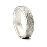 The hammered centre section of this mens 18ct white gold flat court shape wedding ring is perfectly highlighted by the addition of a slight angle to its highly polished edges.