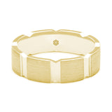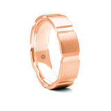 Deep diamond cut grooves along the vertical axis of this mens 18ct rose gold flat court wedding ring add a bold statement to its classic flat court shape.