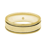 This mens matte polished 18ct rose gold flat court wedding band is encircled by a highly polished, slightly dipped border and completed with a raised millgrain edge.