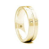 Mens Matte Finish 18ct Yellow Gold Flat Court Shape Wedding Ring With Central Groove and Diamond Cut Accents