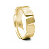 Twelve deep ‘V’ shaped cuts or teeth give a unique and bold look to this mens 18ct yellow gold flat court shape wedding ring with a satin polish.