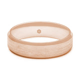 Vertical, finely cut, matte lines running through the centre of this mens 9ct rose gold flat court wedding ring are perfectly contrasted by the smooth, angled edges of its outer perimeters.