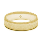 Vertical, finely cut, matte lines running through the centre of this men's 9ct yellow gold flat court wedding ring are perfectly contrasted by the smooth, angled edges of its outer perimeters.