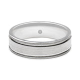 This mens matte polished palladium 500 flat court wedding band is encircled by a highly polished, slightly dipped border and completed with a raised millgrain edge.