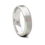The mirror shine polish on the bevelled edges of this matte finished mens palladium 500 flat court wedding ring give a stylish finish to this classic design.