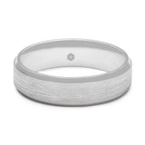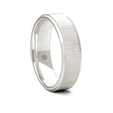 Vertical, finely cut, matte lines running through the centre of this mens palladium 500 flat court wedding ring are perfectly contrasted by the smooth, angled edges of its outer perimeters.