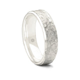 The hammered centre section of this mens platinum 950 flat court shape wedding ring is perfectly highlighted by the addition of a slight angle to its highly polished edges.