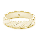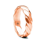 Carving diagonally across this traditional, polished, mens 18ct rose gold court shape wedding ring gives it not only a twisted appearance, but also an unusual and uniquely scalloped edge.