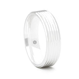 The slightly sloping edges ensure that the grooves encircling this mirror polished mens 18ct white gold flat court shape wedding ring become an immediately striking design.