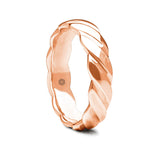 Carving diagonally across this traditional, polished, mens 9ct rose gold court shape wedding ring gives it not only a twisted appearance, but also an unusual and uniquely scalloped edge.