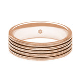 Four grooves are each perfectly adjoined by a millgrain patterned edge on this polished mens 9ct rose gold flat court shape wedding band.