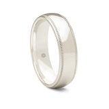 With its classic millgrain patterned edges combined with a traditional polished surface ,this men's 9ct white gold court shaped wedding ring has a timeless and understated elegance.