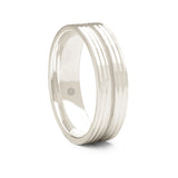 A central textured channel ensures that the highly polished series of grooves are the stand out feature of this men's 9ct white gold flat court shape wedding band.