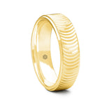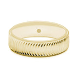 The flat, highly polished edges of this men's 9ct yellow gold flat court shape wedding ring contrast perfectly with the precisely placed, semi-circle cuts that flow through its centre section.