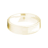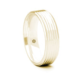 The slightly sloping edges ensure that the grooves encircling this mirror polished 9ct yellow gold flat court shaped wedding ring become an immediately striking design.