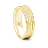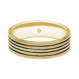 Four grooves are each perfectly adjoined by a millgrain patterned edge on this polished men's 9ct yellow gold flat court shape wedding band.