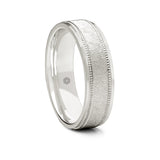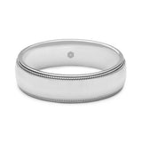 Polished outwardly from the centre of this mens flat palladium 500 court wedding ring, this ring’s polished edges give way to a slim textured central area bordered with a millgrain pattern.