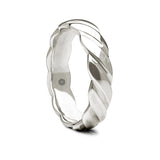 Carving diagonally across this traditional, polished, mens palladium 500 court shape wedding ring gives it not only a twisted appearance, but also an unusual and uniquely scalloped edge.