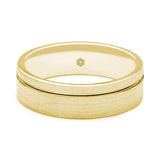 This mens 18ct rose gold flat court shape wedding ring with its comfort fit on the inside features a brushed satin surface and is finished off with the addition of an off-set, high shine groove.