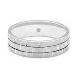 The addition of two circular grooves with some vertical detailing give the satin finish on this mens 18ct white gold flat court shape wedding ring a pattern reminiscent of traditional brick-work.