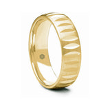 This matte finished mens 18ct yellow gold court shape wedding ring features a series of highly polished and hand-carved grooves around its circumference.