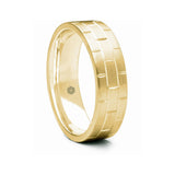 The addition of two circular grooves with some vertical detailing give the satin finish on this mens 18ct yellow gold flat court shape wedding ring a pattern reminiscent of traditional brick-work.
